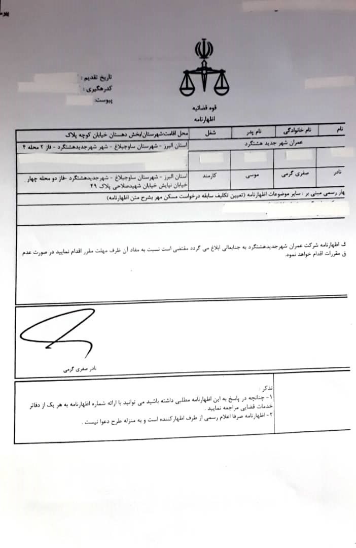 «نظر به اینکه علیرغم اخطاریههای اعلامی تاکنون نسبت به وضعیت عضویت و به تبع آن ایفا و انجام تعهدات،تکالیف و وظایف خود اقدامی به عمل نیاوردهاید و مستند به قوانین و مقررات و بخشنامههای ابلاغی بالاخص بند 12 مصوبه شواری تامین مسکن استان البرز ابلاغی به شماره .... مورخ .... و بند 6 صورتجلسه مورخ .... به شماره ابلاغی ..... مورخ ..... و بند 10 صورتجلسه مورخ 97/7/8 و حسب اختیارات حاصله و وظایف محوله قانونی نهایتا منجر به حذف عضویت جنابعالی از طرح مسکن مهر در شهر جدید هشتگرد گردیده است.